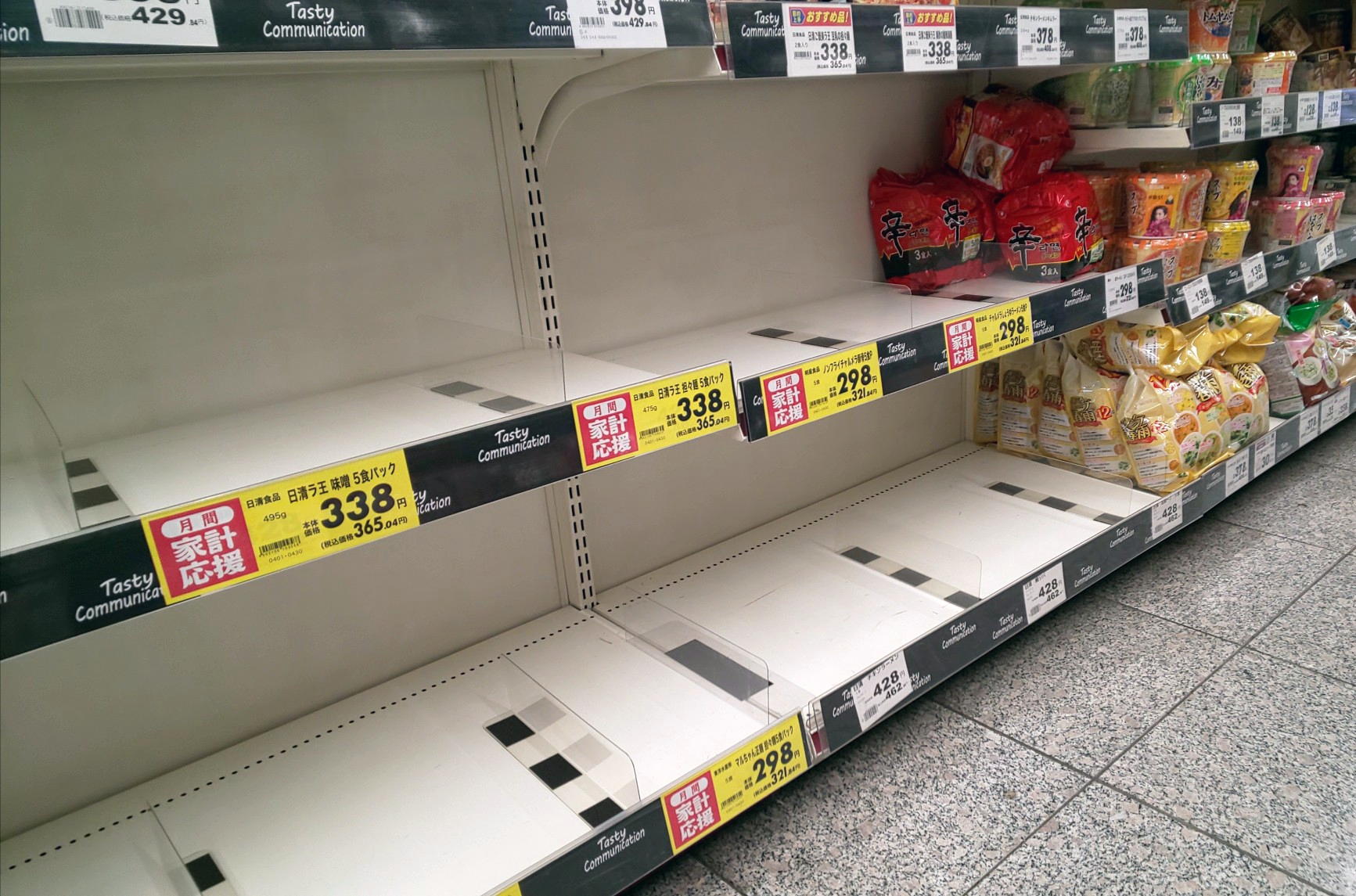 1名無し2020/04/07(Tue) 01:47:20ID:UyNDEyODQ(1/21)NG報告緊急事態宣言のニュースで対象地域以外の地域でも買い溜めがはじまった。6日に仕事帰りに寄ったショッピングセンターの袋麺コーナー。本当の話しだったとは驚く。日本ではNo Koreaはしていない。値段も他の商品と同じ価格。しかし要らないものは要らない。>>4>>19>>81>>99>>104>>105>>125>>132>>14518