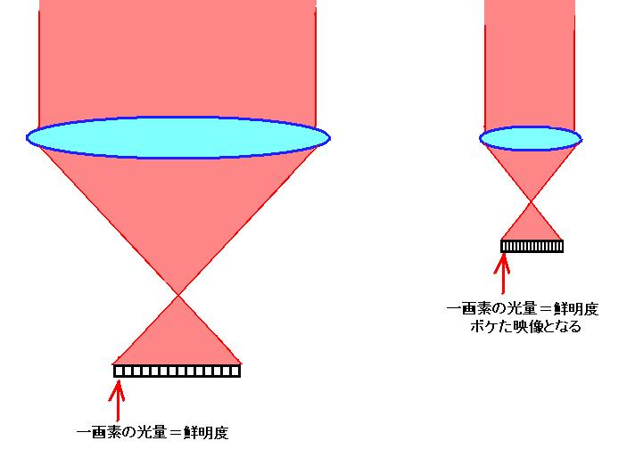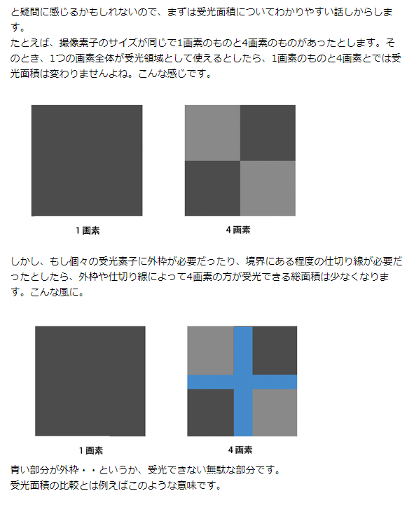 そのため、撮像素子の画素数が増えると受光面積は小さくなって、ダイナミックレンジが低くなり画質は低下します。