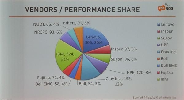 システムのベンダー別では、聯想集団(レノボ・グループ)が174システムで最多。これに中科曙光の71システム、浪潮集団の65システムが続いた。この3社が上位を独占した。