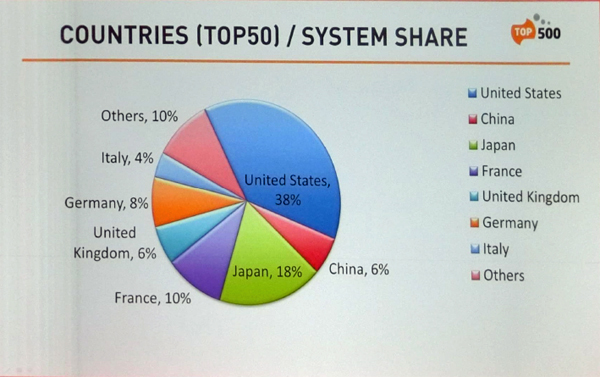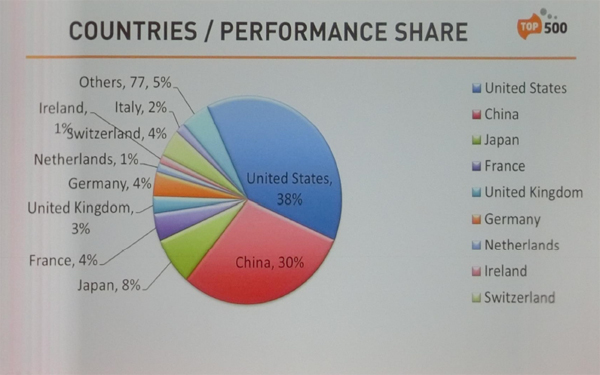 中国は今回の順位発表で1位を日本に奪われ、上位500スパコンのうち、212台を保有するほど質と量の面でスパコン大国になった。米国が113台で2番目に多く、日本(34台)、ドイツ(19台)、フランス(18台)が続いた。