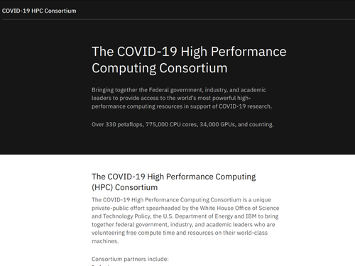 新型コロナウイルス感染症(COVID-19)の世界的な流行に、テクノロジーの力で対処すべく、米国の大手ITベンダーと国家研究機関が連携して「COVID-19ハイパフォーマンスコンピューティングコンソーシアム(https://covid19-hpc.mybluemix.net/、画面1)が立ち上がった。