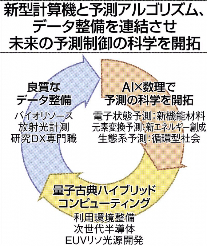 これを支えるため理研に数十人規模の研究DX(デジタル変革)の専門職を設ける。生物資源や量子機能物質などのデータを整えて蓄える。これを人工知能(AI)が学習して未来を予測する。計算機開発とアルゴリズム開発、データ整備の三つを有機的に連結させ、未来の予測制御の科学を開拓する。