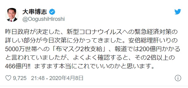 ちょっと調べたが200億ってのはマスク1枚200円程度という発言を元にマスコミが勝手に5000万世帯に配ったらマスク代だけで200億になると言ってるだけで、政府は誰も予算を200億だなんて言ってないな。>>50