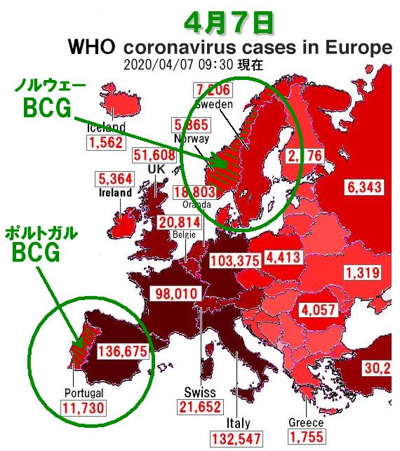 ノルウェー 6,042 + 0 、死亡101 +12、重症 78 ←BCG接種国