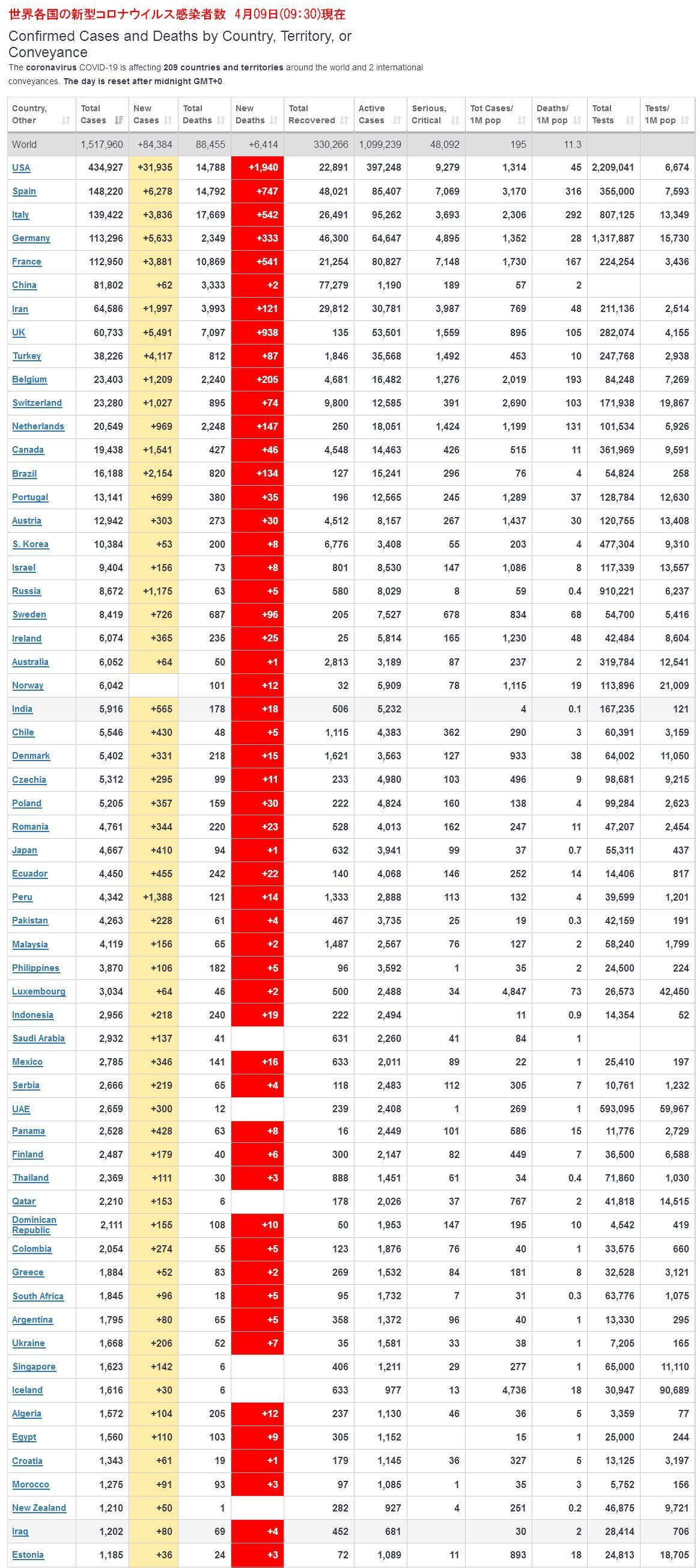 スペイン 148,220 +6,278、死亡14,792 +747、重症7,069 ←BCG廃止国