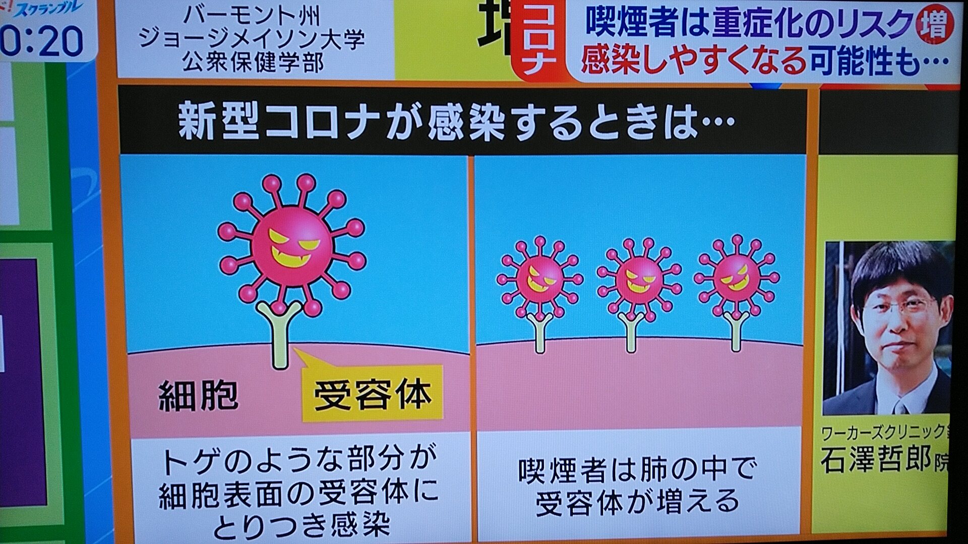 ウイルスが着いた煙と言う微粒子が充満すると言う意味ではタバコは危険かもしれないな。