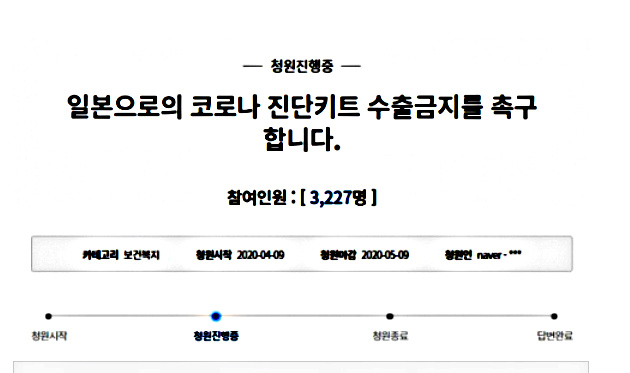 9日、大統領府国民請願ホームページには「日本へのコロナ19診断キット輸出禁止を促す」というタイトルの国民請願が掲載された。