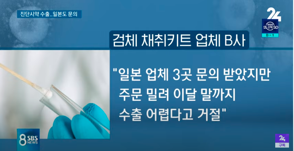 검체 채취키트 업체 B사는 일본 업체 3곳의 문의를 받았지만 주문이 밀려 이달 말까지는 수출이 어렵다며 거절했다고 밝혔고, 또 다른 진단시약 업체 2곳은 무역 대행사를 통해 수출 문의를 받은 상태라고 했습니다.