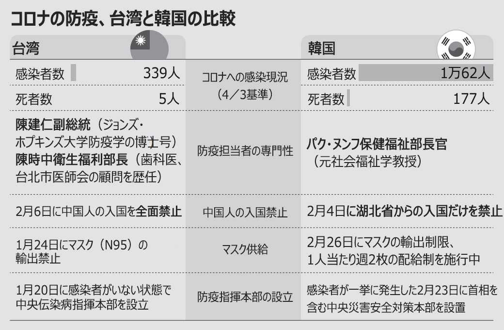 一方の韓国は感染者数が1万62人と、台湾の30倍に上っている。死者数は177人で、台湾の実に35倍に当たる。
