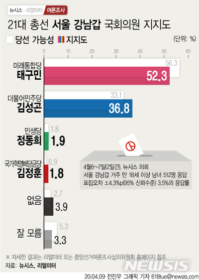 [마지막 여론조사] 서울 강남 갑 태구민 52.3% vs 김성곤 36.8%