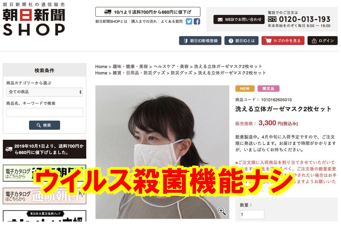 朝日新聞のオンラインショップで販売されていたのは「洗える立体ガーゼマスク2枚セット 3300円(税込み)」で、「洗って繰り返し使える、マスク品薄下の救世主」などという謳い文句が付けられていた。なお、現在は「政府が緊急事態宣言を出す方針を固めたことに伴い、お客様からの受注を、期間未定で停止いたします」としてオンラインショップは閉鎖されている。