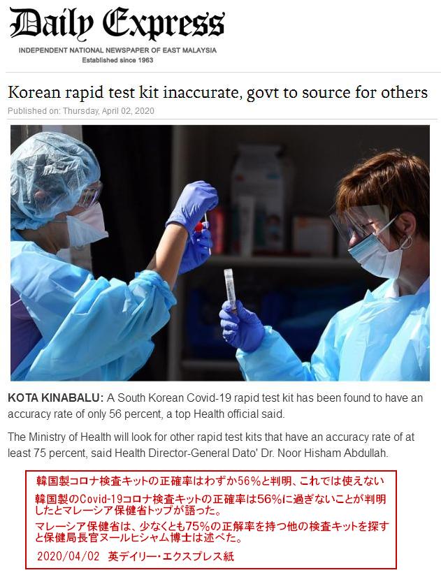 マレーシア保健省トップ「韓国の迅速診断キットをテストしたが精度が56%で使い物にならなかった」