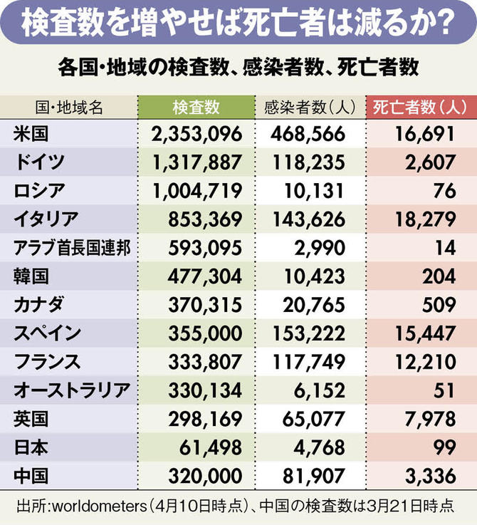 ・ドイツは48万3295人検査→ 感染 9万1159人= 発見率18.8% (4/4現在)