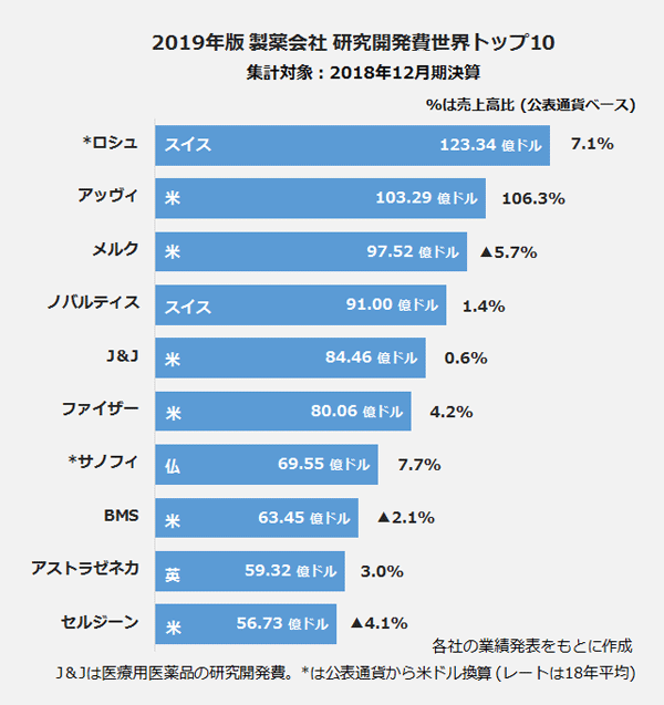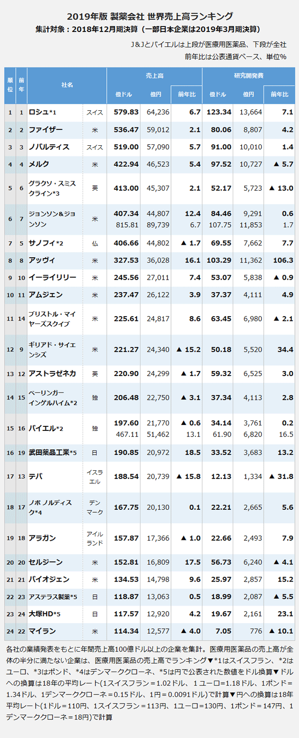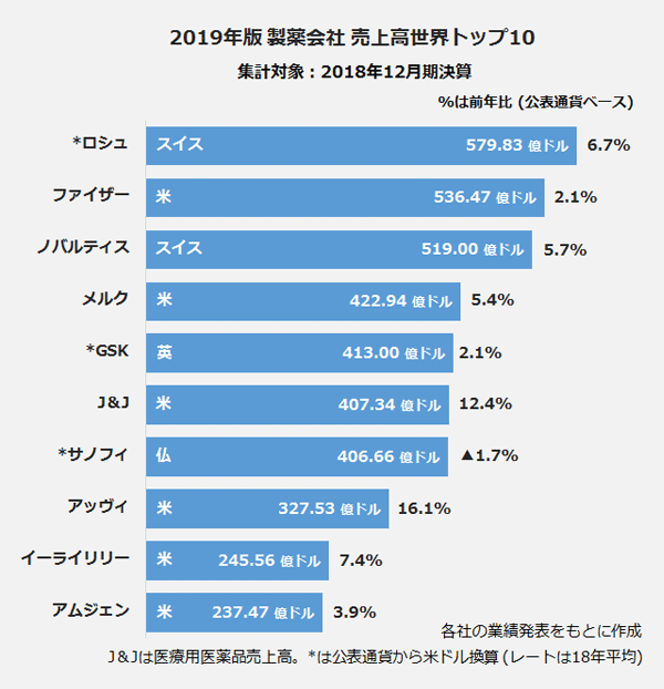 【2019年版】製薬会社世界ランキング 売上高トップはロシュ、2位はファイザー―上位陣は軒並み増収