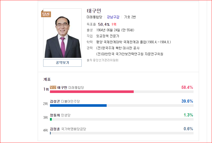 1名無し2020/04/16(Thu) 10:23:19ID:U0MzY2MDg(1/1)NG報告미성년자 강간, 공금횡령 죄 때문에 망명한 前 북조선 외교관이 탈북한지 4년만에 한국국회에 입성했다..상위 10 % 최고 부자들만 살고있는 강남구에서 58.4% 득표울로 국회의원이 됐다.국회의원 당선되면 국가정보, 군사비밀,을 손쉽게 얻을수 있다.북조선 정보, 남조선 정보를 모두 가지고있는 이중간첩? .>>2>>3>>5>>6>>11>>20>>33>>48>>531