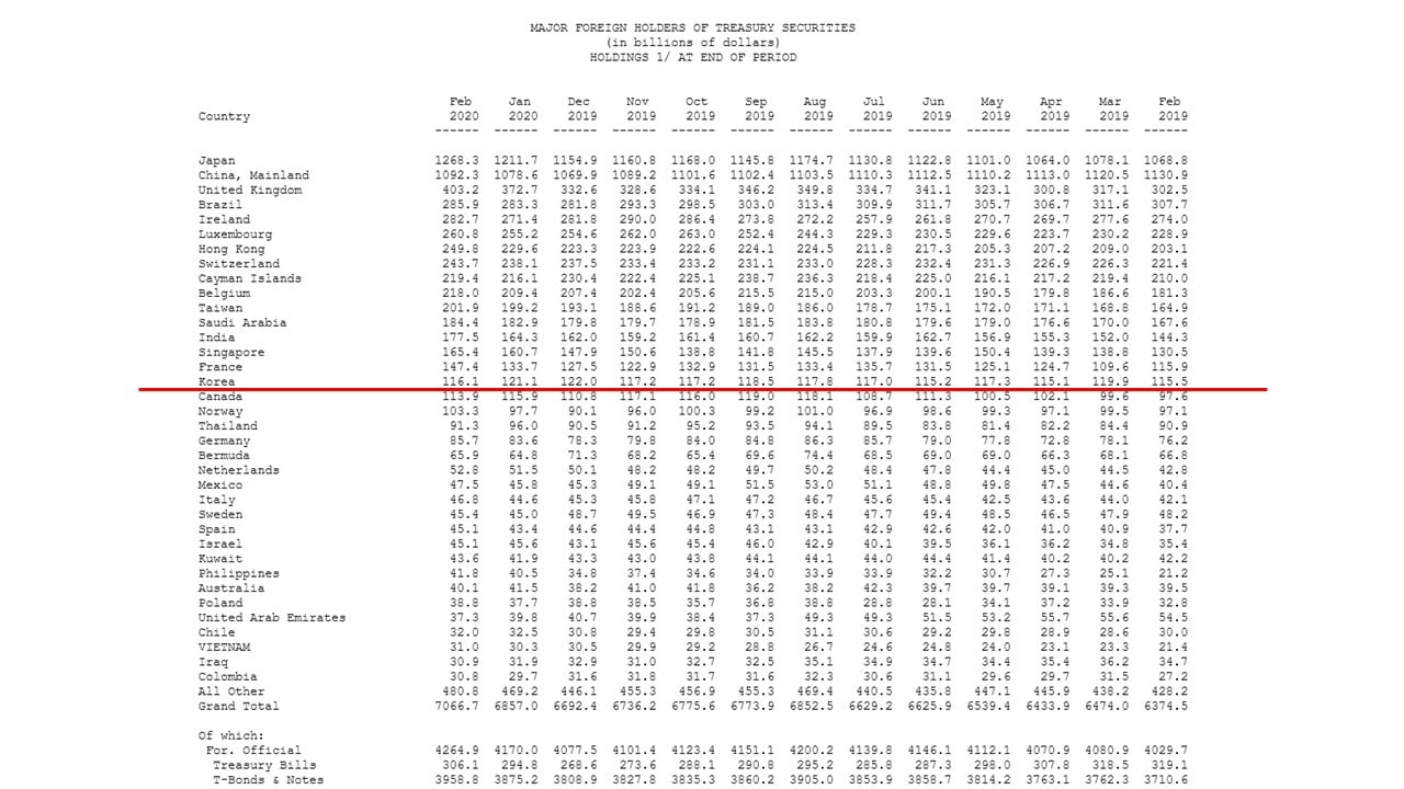 これによれば、韓国は2020年02月末時点で合衆国公債を「1,161億ドル」分保有していることになります。