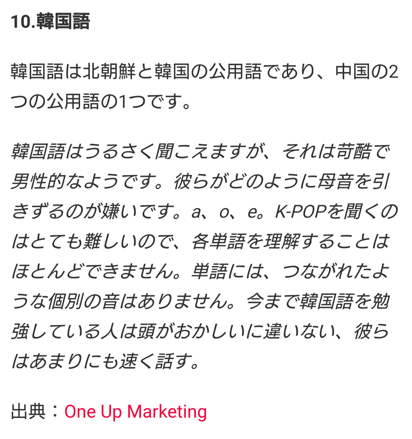 認知されていない国の言葉なら凄く綺麗な言葉であっても評価がされる事がない真面目に言うと韓国語の語尾の「スミダ~」や「ニダ~」の伸ばす部分がだらしないと言うと吐き捨てるようなイメージがある。