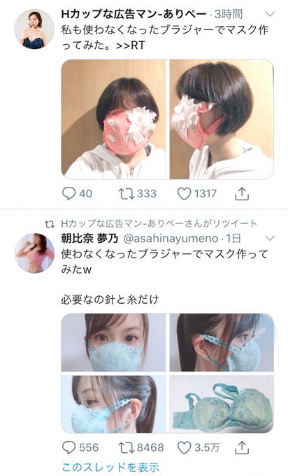 コロナ禍をうけてマスクの品薄状態が続き、通常はマスクを製造していない会社がマスクの生産に乗り出す「異業種マスク」が話題を呼んでいます。そんななか、女性の下着をおもに縫製するAtsumi Fashion(@AtsumiFashion)が、「ブラジャー屋が本気出してみた」とレースがついたピンクのマスク画像をツイートしたところ、5.3万リツイートと23万いいね!がつきました。