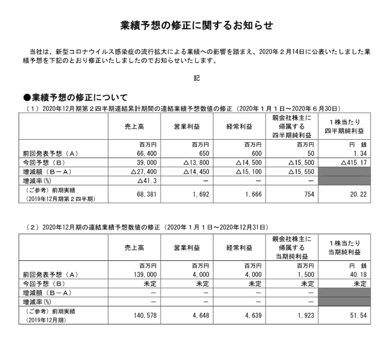 その後は日本国内でもコロナ感染が拡大、2Q決算で今期予想を再度、大幅に下方修正した。
