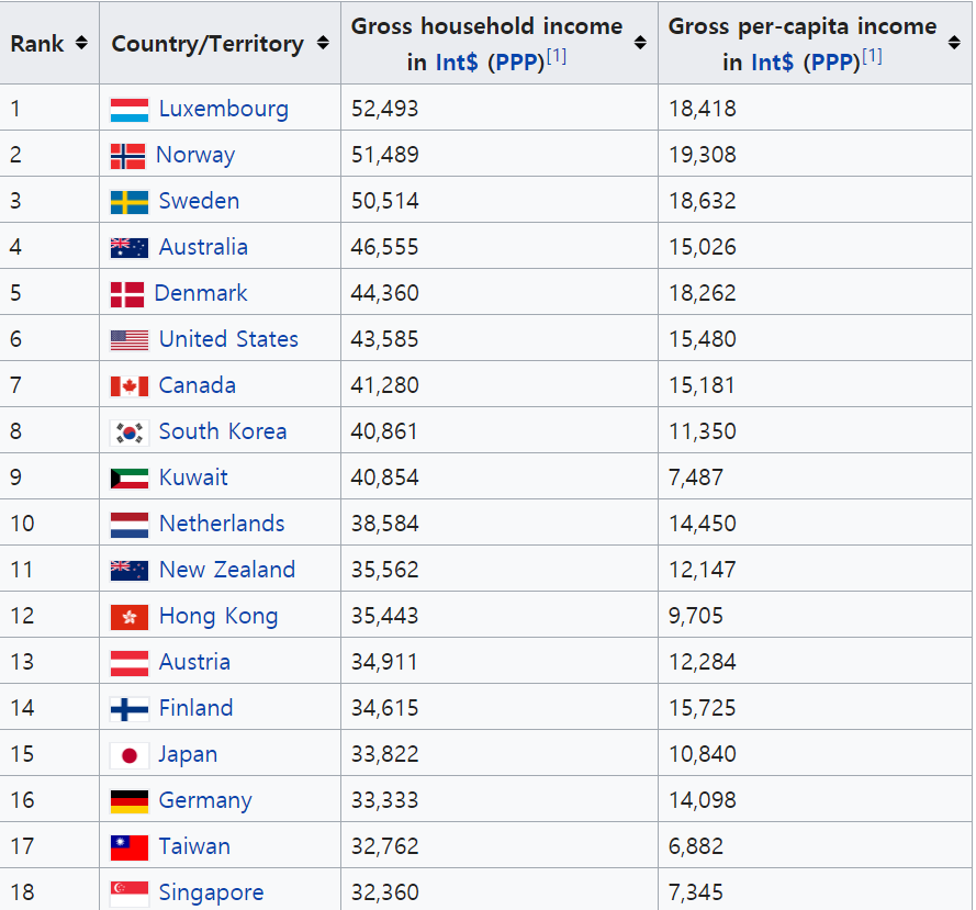 승리,패배같은 단순한 논리가 아닙니다 이 자료는 한국인 1 인당 평균 구매력이 일본인보다 비교적 더 부유하다는 것을 의미하지만 시장 분배와 총 국력을 나타내는 지표는 아닙니다. 여기에 추가적으로 중위소득과 가처분소득,평균자산과 부채를 고려해야지 객관적인 비교가 가능한 것입니다>>59