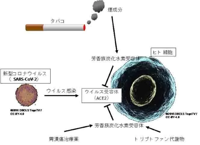 広島大学の研究チームは、新型コロナウイルス(SARS-CoV-2)がヒトに感染する際に利用する受容体の構成タンパク質の1つである「ACE2」の発現がタバコの煙成分によって低下することや、それが芳香族炭化水容体(AHR)を介して低下すること、およびその機構と関与する化合物を明らかにした。