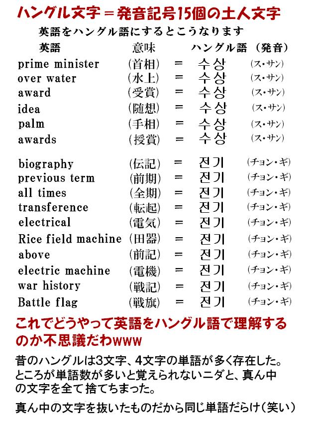 そもそも「訓民正音」と呼んでいたぐらいの「民に正しい音を教える」と言う「フリガナ」に使う発音記号だった物なのに、『これで十分nida~~!!』とか言って「音」だけ残して「意味」を捨ててしまった。