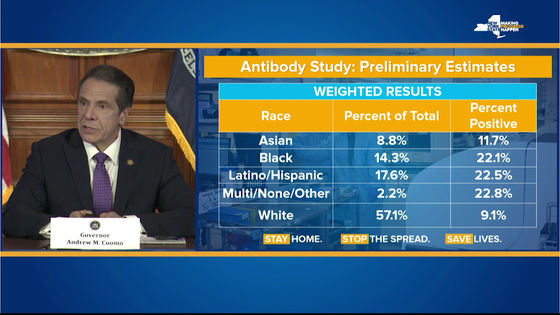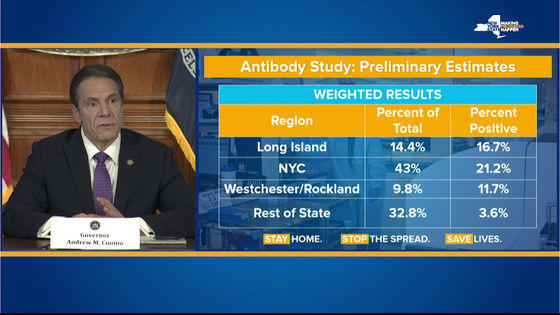 米ニューヨーク州のクオモ知事は23日の会見で、州内で無作為に選んだ3000人に新型コロナウイルスの抗体検査を行った結果、14%近くの人が抗体を持っていることがわかったと発表した。