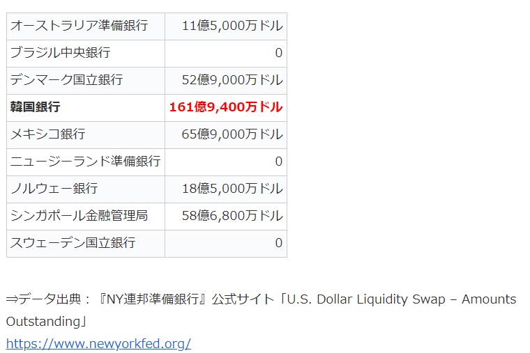 Money1で何度もご紹介している韓国の「『通貨スワップ』の利用額」とは、このドル流動性スワップを利用して合衆国から「いくら借りたか」、そして「現在いくら未返却か」を指しています。