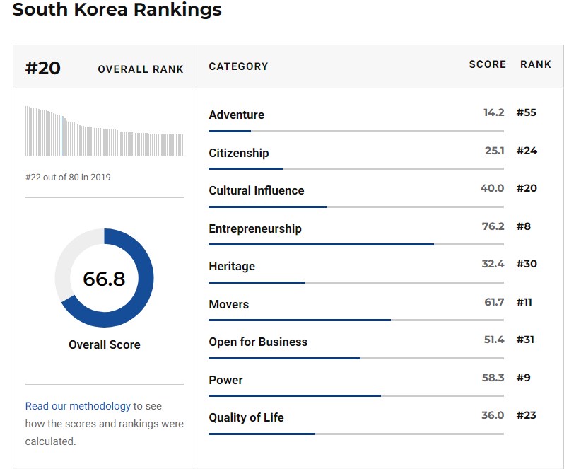「世界最高の国ランキング2020」を発表。韓国は20位の快挙、一方日本は…。