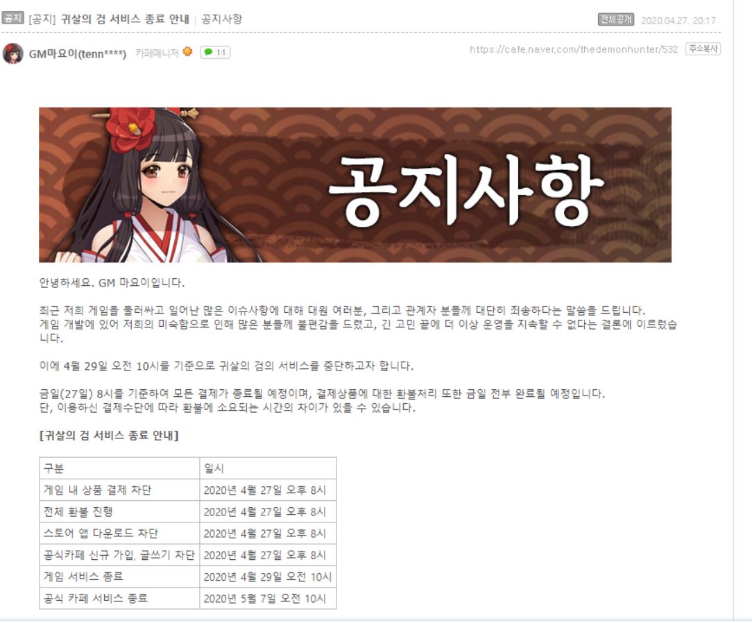 그 이후 이 회사는 공식적으로 서버 종료를 알리고 환불 진행 후 공식 까페까지 서비스 종료 하는 절차에 들어갔다.