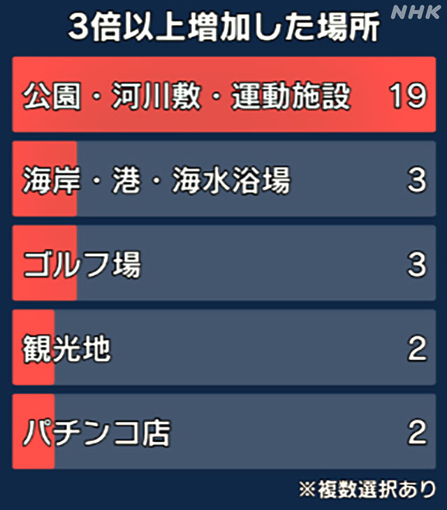 赤で示すのが、人出が3倍以上に増加した場所、合わせて67か所ありました。