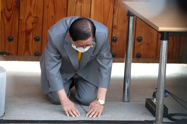 姿を表した施工会社代表イ氏は1分余り壇上に伏せたまま間違ったという言葉だけを繰り返すと、