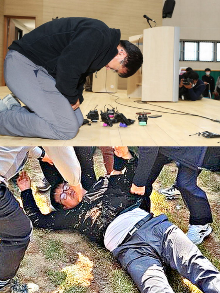 体育館を出たイ代表は、すぐ体育館の隣の芝生に倒れた。会社の従業員が立ち上がって、警察に「警察はどこですか?助けて」と叫んだ。