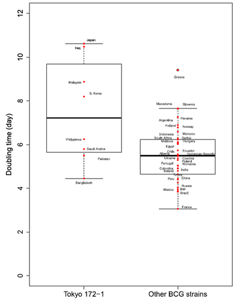 おもしろいのは東工大の論文で、BCGの株(strain)の違いを分析して、BCG義務国と非義務国の違いより、日本株(Tokyo 172)と他の株の違いのほうが大きいという。これによると、左上の日本は世界一安全な国である。