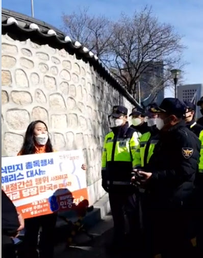 これに対し警察が"1人デモを場所している場所は米国大使公邸の塀のすぐ前だ。 国連"外交関係に関するウィーン条約"に基づき不法"とし、離撃措置を取ると通知した。 警察は、金候補が昨年10月に米国大使公邸を越えた経歴があるため、安全を理由に金候補のデモを許可しなかった。 すると金候補は"私を予備犯罪者扱いしている"と30分間ほど席を守り、現場を離れた。 金候補は"国会議員候補としてハリス大使の植民地総督行為に対しても政治的意思を含んだピケット行為をすることができる"と主張した。