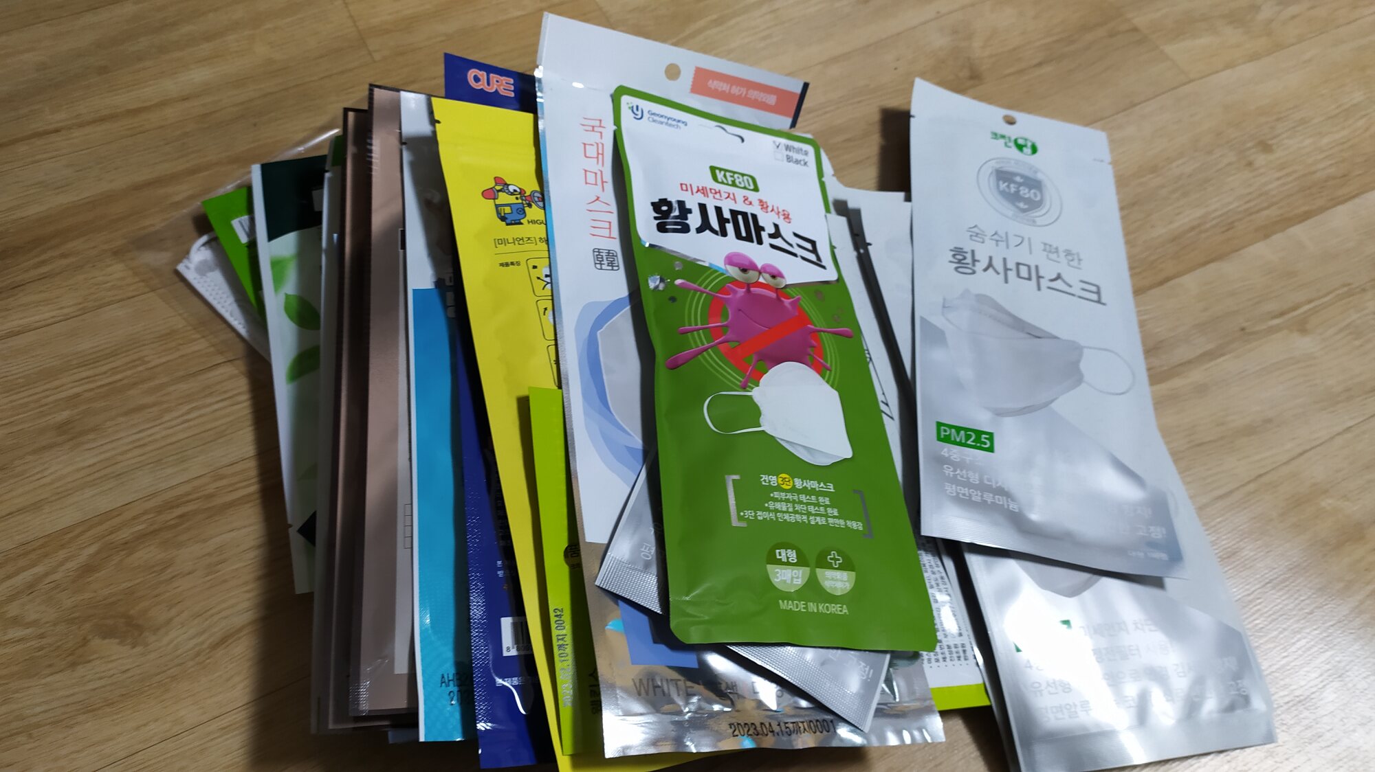 2月に買ったひと箱以外は 全部もらいもの。使い捨てが40枚位。布マスク6枚。