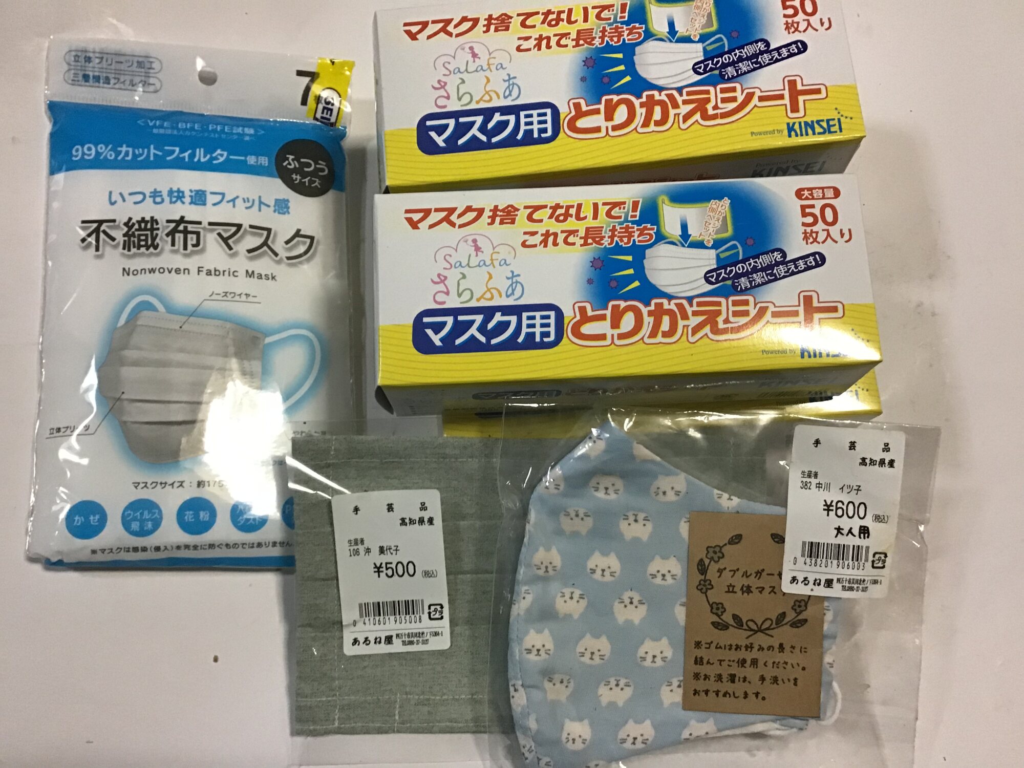 国産 不織布マスク60枚、日本規格設計の中国製不織布マスク30枚、再生可能マスク5枚、手作りマスク4枚