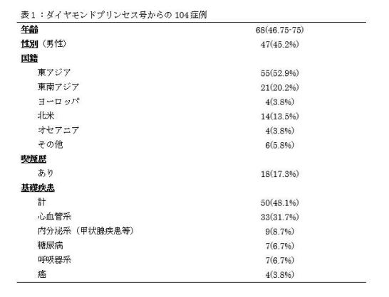 乗っていたのは日本人以外にも欧米人もいました。患者の平均年齢は68歳で国籍は17の国と地域。48%に基礎疾患あり、高血圧が最も多かったとのことなので、要するにウイルスを大量に吐いて、感染しやすく、感染させやすく、発症しやすく、重症化しやすい高齢者が多く、しかも新型コロナって人ごとかの時だったのでマスクどころか手洗いもしていなかったはず。それなのに