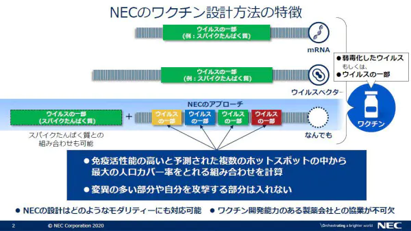 https://nikko.us/20/036.htmlNECとNECオンコイミュニティのAIによる予測技術を活用し、ワクチンの設計を行った。具体的には、公開されている新型コロナウイルスの数千種類のゲノムデータを参照。新型コロナウイルスのタンパク質(遺伝子)のアミノ酸配列の中から、細胞表面にある糖タンパク質である主要組織適合性遺伝子複合体と結合しやすいか、細胞表面で認識できるようになるか、免疫細胞の一つであるキラーT細胞の活性を高めやすいかなどを指標とし、AIで免疫活性能が高いと思われるエピトープの部位を同定した。