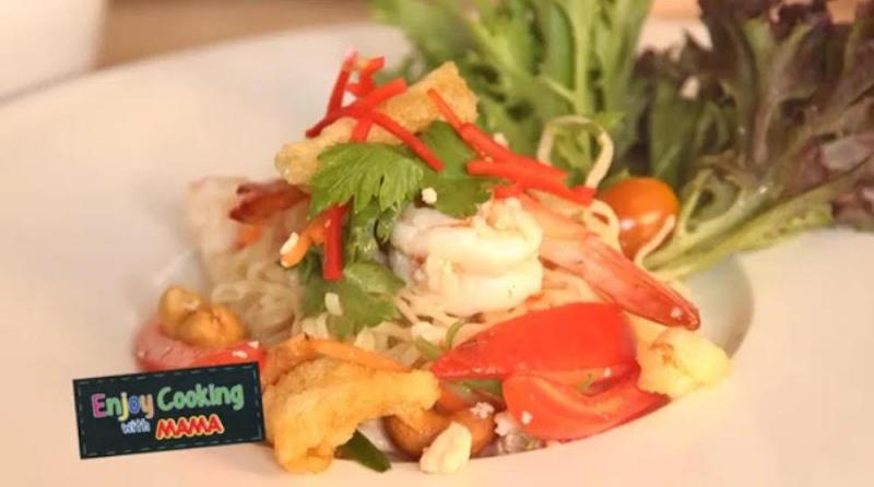 ヤムサラダ (ยำปลาหมึกยักษ์) に茹でたインスタント麺を和えたもの。