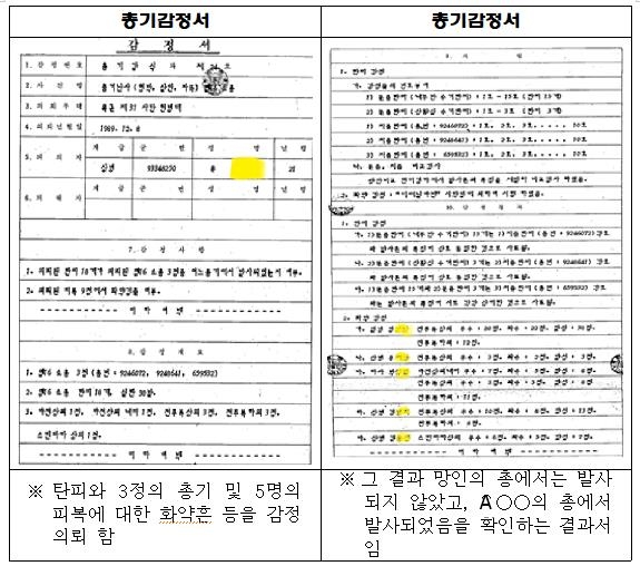 (ソウル=聯合ニュース)君がずさんな捜査で他殺の可能性がある兵士を「銃乱射事件」の主犯で運転し、「自爆死亡」に急いで結論出した事実が31年ぶりに世に知られるようになった。写真は、委員会で再調査した乳母兵事件当時、死亡した油消費者物価指数ではなく、他の部隊員であり、唯一の生存者Aさんの銃が発射されたという感情結果書。しかし、当時の軍の憲兵隊をその記録が欠落している。