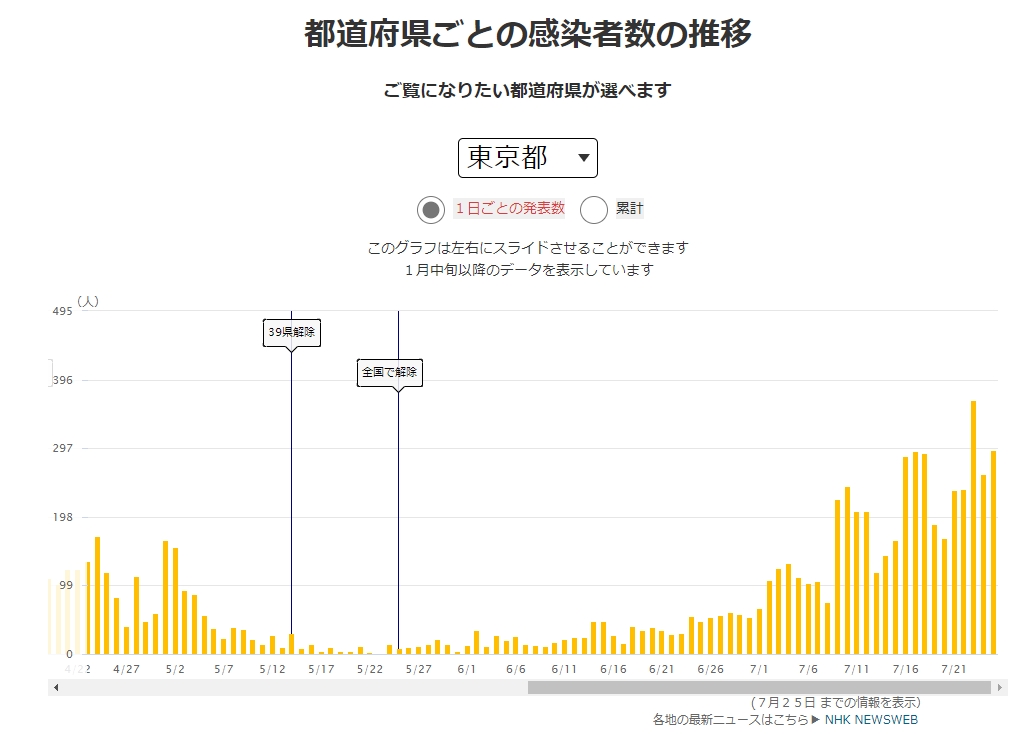 感染者数に関しては4月をピークとする山よりも、7月をピークとする山の方が高く、かつ大きくなっている。ただ犠牲者数に関しては、まだまだ高さも大きさも及ばない。