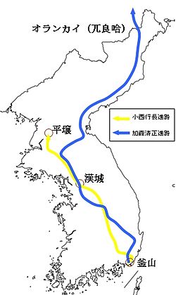 朝鮮出兵における加藤清正と小西行長の進軍ルートだ>>1