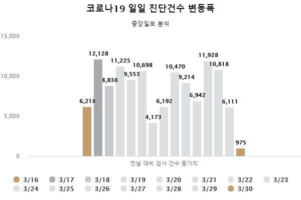 3월 31일의 975는 검사수가 975가 아니라 3월 30일에 비해서 +975만큼 늘어난 것이다
