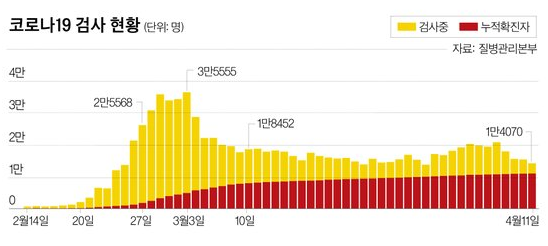 https://coronaboard.kr/ 을 참조하면 3월 31일경 13,531명을 검사했음을 알 수 있습니다