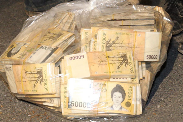 ウォンは50000ウォン札しかないから、単純に日本円10億の分の福沢諭吉と同じ重量