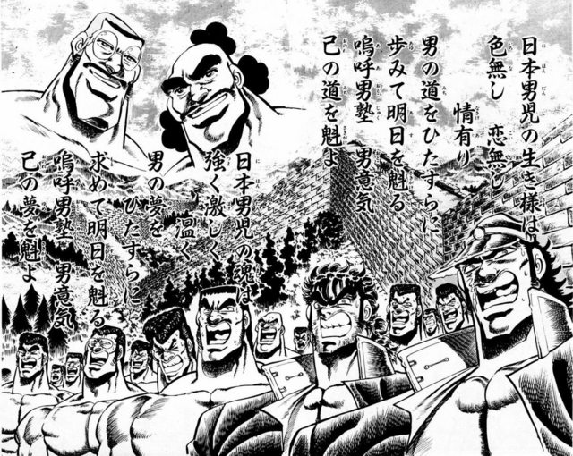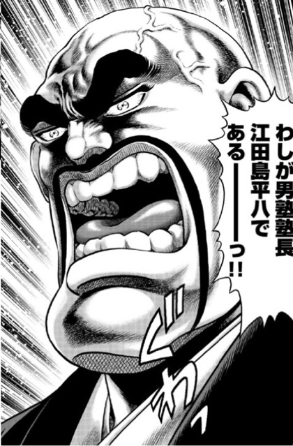 「魁!!男塾」は、1980年代に人気を博した少年漫画。江田島平八は、男塾の難題を一挙に解決する塾長として登場する。