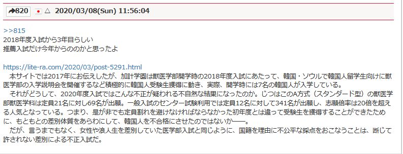 【差別ニダ】韓国人受験生を全員不合格 加計学園獣医学部