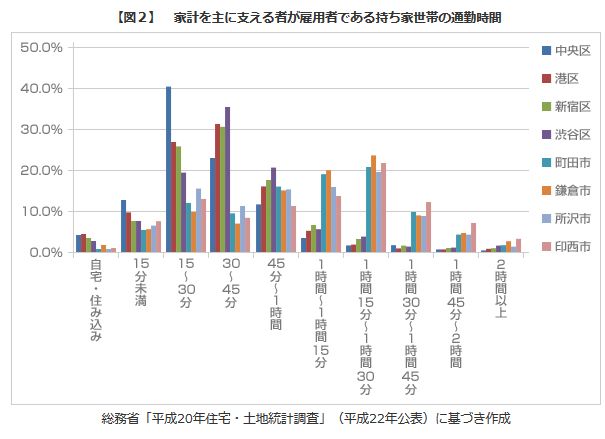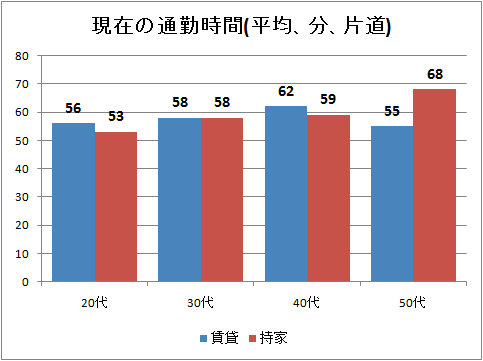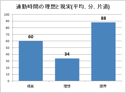 調査母体に対し主な通勤手段を尋ねたところ、電車がもっとも多く66.8%、次いで自動車21.3%という結果になった。それではそれらの手段を用いて、一日どれくらいの通勤時間をかけて出勤しているのだろうか。平均・片道で聞くと、平均では1時間(60分)という結果が出た。それに対し「理想の通勤時間」は平均34分と、現実は理想の2倍近い値を示していることが分かる。大阪国際空港近隣です