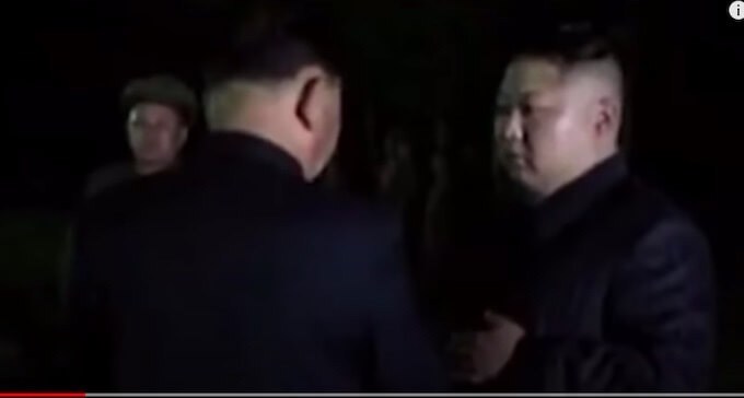2017年7月28日に撮影された北朝鮮製大陸間弾道ミサイル「火星14号(Hwasong-14)」の発射実験施設において、あの特徴的な刈り上げた髪型と黒い人民服を着た金正恩氏らしき人物が、黒いピンストライプのスーツとキューバンヒールを着用したこれまた金正恩氏と思われる人物と会話している姿が収められているのだ。